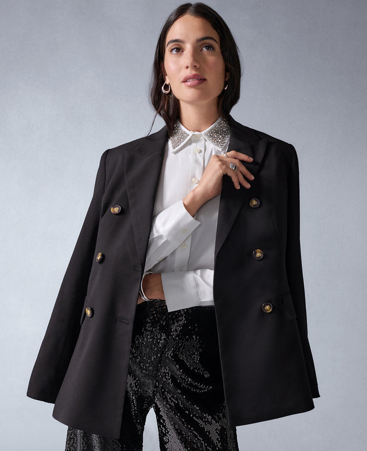 Impeccible tailoring at its best, this blazer boasts an elongated cut that’s extra sleek and streamlined. Peak lapels. Double breasted buttoned front. Long sleeves with button cuffs. Front flap besom pockets. Back vent. Lined.