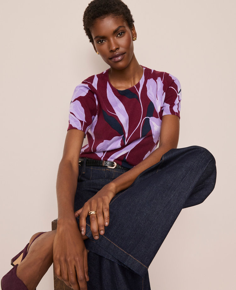 Designed in an effortless tee silhouette, this floral sweater gives workday tailoring a polished and chic finish. Crew neck. Short sleeves. Ribbed neck, cuffs and hem.