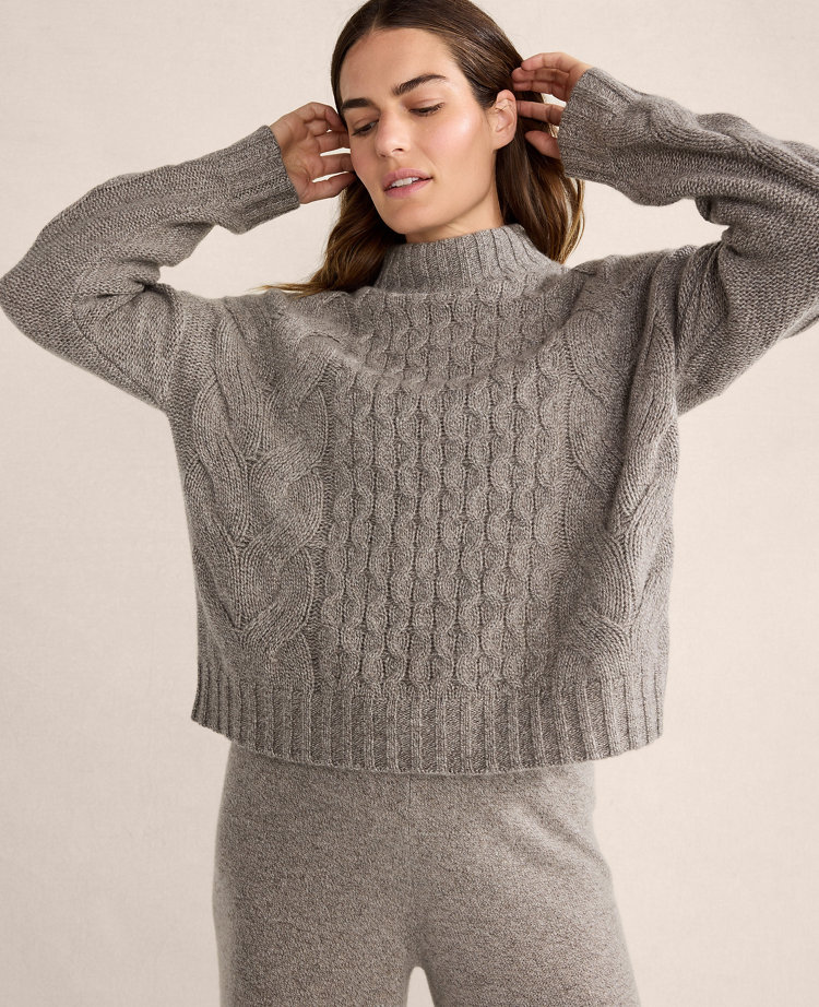 Haven Well Within. A thoughtful collection of lounge, sleep, home, and lifestyle essentials — and your trusted resource for all things wellbeing. Welcome cold weather in this luxuriously soft mockneck sweater. Chunky cabling adds a luxe tactility while slightly extended sleeves provide extra warmth. Long sleeves. Ribbing at neck, hem, and cuffs.