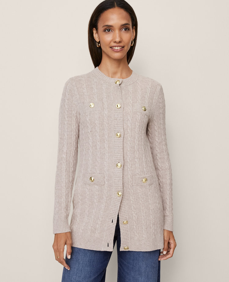A long layer with intricate cable knit texture, this cardigan is one you’ll wear season after season.Ribbed crew neck, placket cuffs and hem. Front button closures. Long sleeves. Front faux buttoned-welt pockets.
