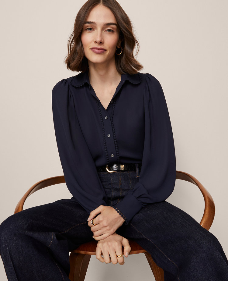 Pretty bobble detailing and voluminous blouson sleeves imbue this shirt with an insouciant polish and chic appeal. Point collar. Button front. Drop shoulders. Long sleeves with button cuffs.