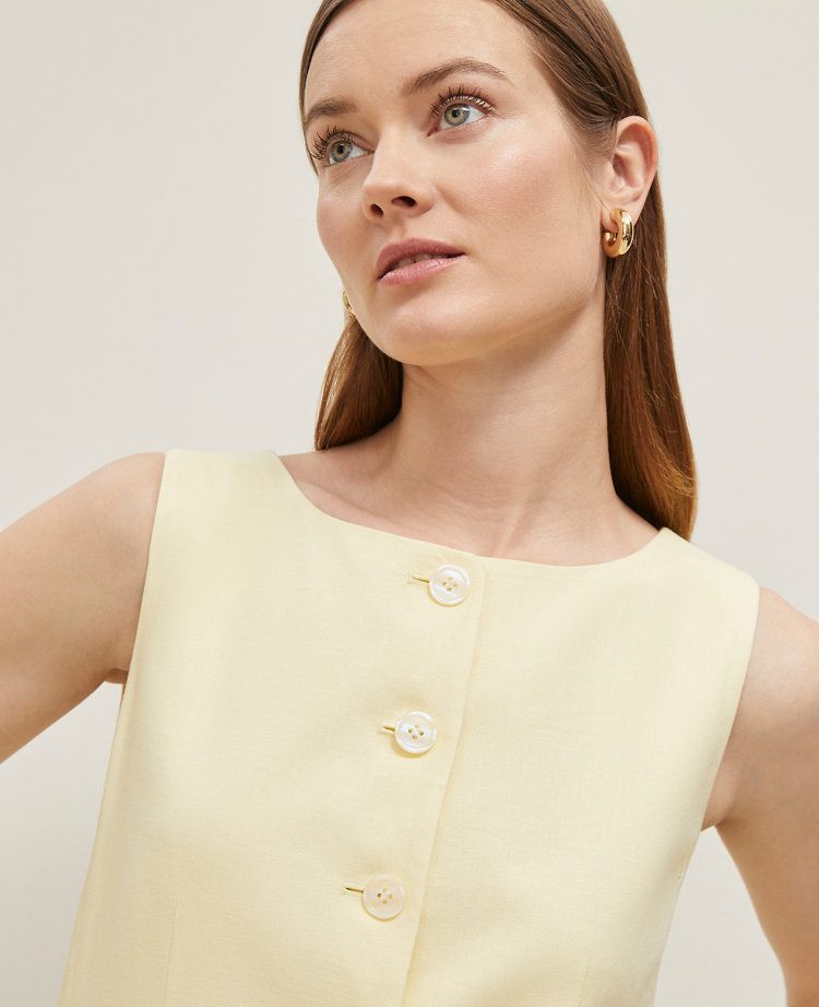 Sculpted with long, lean lines and finished with fresh patch pockets, this linen-blend vest is a modern layer. Ballet neck. Front button closures. Front patch pockets. Back vent.