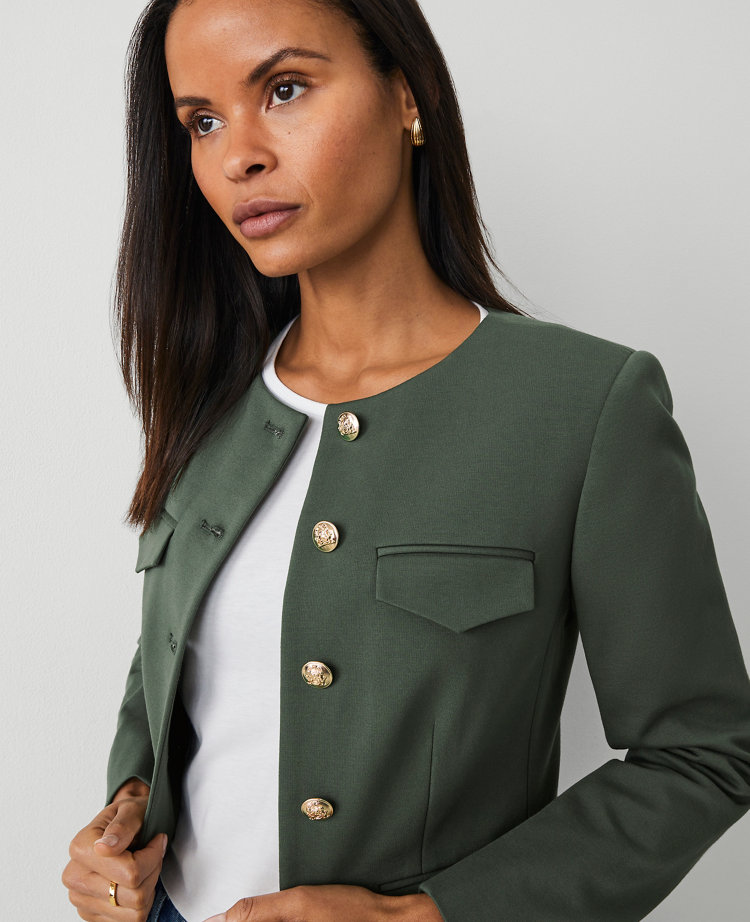 In a smooth ponte knit, our crew neck jacket features clean lines and polished button details. Round neck. Button front. Long sleeves with button cuffs. Four front flap pockets. Lined.