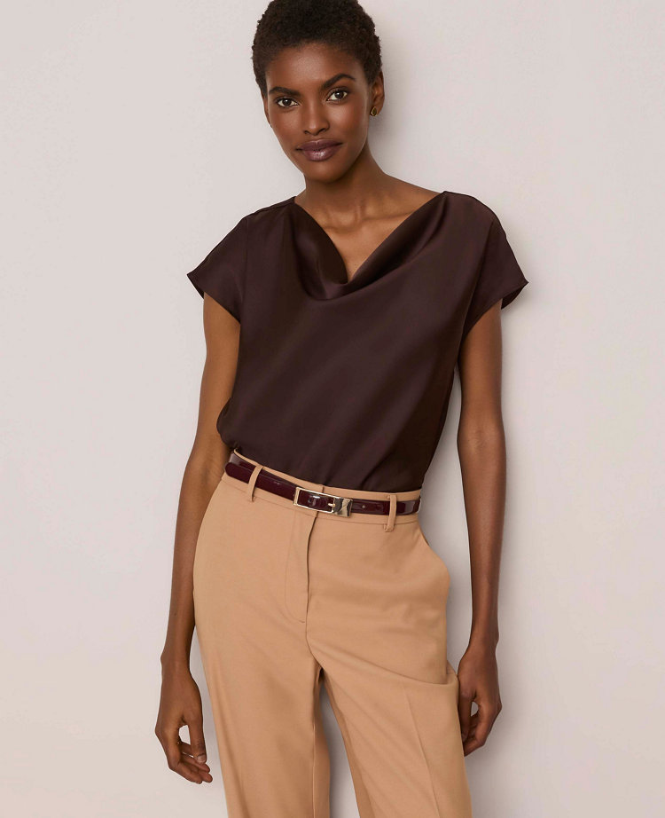 A chic draped neckline creates an artful silhouette with a touch of feminine charm. Cowl neck. Short sleeves.