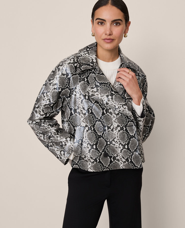 Equally statement-making and elevated, this snake print coat is perfect for pulling together your go-to looks.Notched lapel. Long sleeves. Double breasted button front. Angled front welt pockets. Adjustable buckle belt.