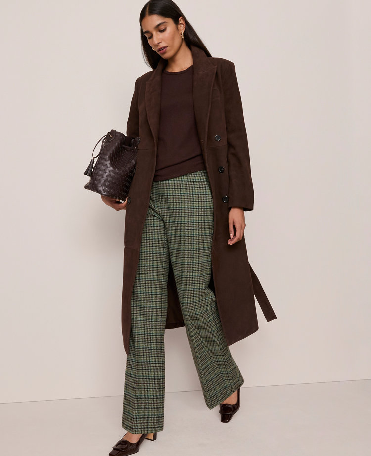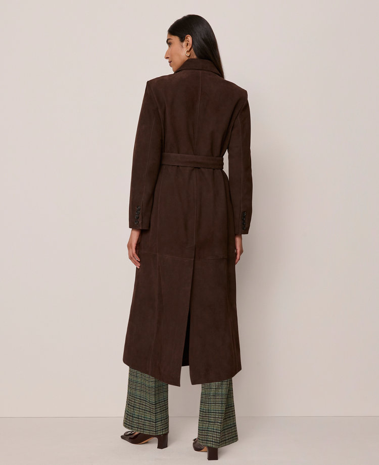 Exquisitely designed with premium fabrics and thoughtful details, this timeless piece will effortlessly elevate your style. Designed in smooth, sumptuous suede, this luxe trench coat is the perfect layering piece between seasons. Notched lapels. Long sleeves with button closures. Removable tie belt. Angled welt chest pocket. Front flap patch pockets. Back vent. Lined.