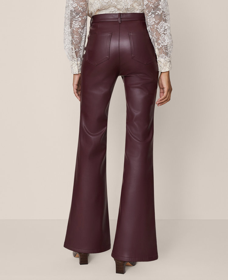 Done in sleek faux leather, these flared pants are the perfect balance of modern styling and timeless appeal. Front zip with button closure. Belt loops. Front patch pockets. Back welt pockets.