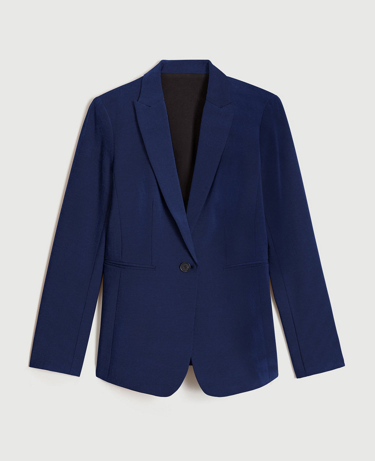 Refined four-way stretch holds its shape while flattering yours – so you stay polished and comfortable from A.M. to P.M. Peaked lapel. Long button-open sleeves allow for versatility in styling. One button front. Front besom pockets. Back vent.