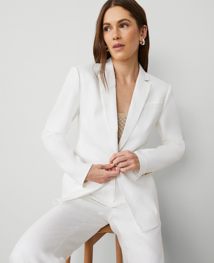 Smoothly structured with a custom tailored feel in a breathable linen blend, our classic blazer is a modern suiting essential. Notched lapels. Single button front. Long sleeves with button cuffs. Chest welt pocket. Front besom pockets. Back vent. Lined.