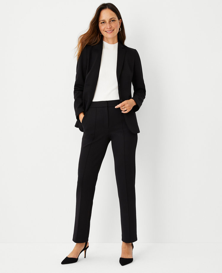Formerly known as the straight pant, our sophisticated and timeless straight-leg pant has a classic lean fit for a chic, structured silhouette. This stretchy yet sophisticated wrinkle-resistant fabric is comfort-chic at its finest. It also plays very well with others—mix and match the collection with ease. Front zip with double hook-and-bar closure. Front pintucks. Front off-seam pockets. Back besom pockets. Shop all Double Knit Suiting