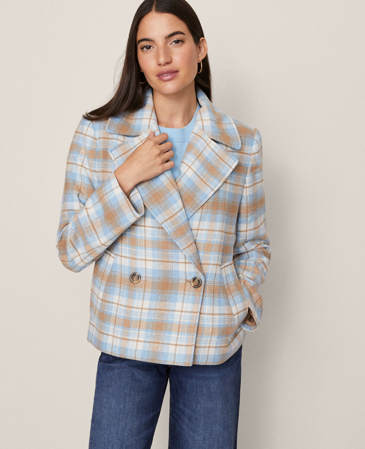 Discover Ann Taylor Weekend. Effortlessly polished pieces for wherever your plans take you. Brighten up chilly days with this plaid coat that’s equally sophisticated and chic. Notched lapel. Long sleeves. Double breasted button front. Angled front welt pockets. Back vent.