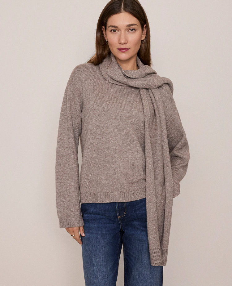Discover Ann Taylor Weekend. Effortlessly polished, lived-in looks for wherever your plans take you. Versatile and polished, this sweater is designed with a removable scarf you can loop around your neck or drape over one shoulder. Mock neck. Long sleeves. Back-button removable scarf. Ribbed cuffs and hem.